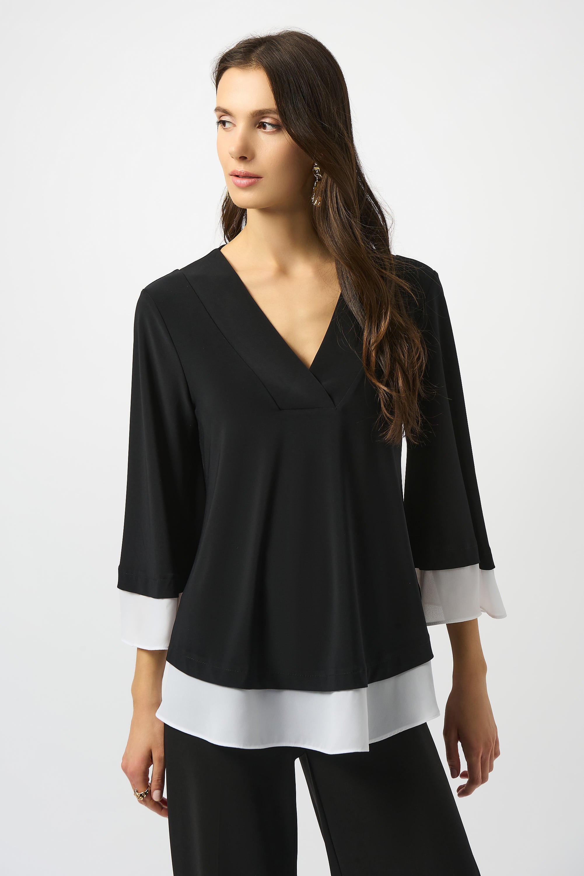 Joseph Ribkoff Black/Off White Silky Knit & Georgette Colour Block Flared Top Style 253082