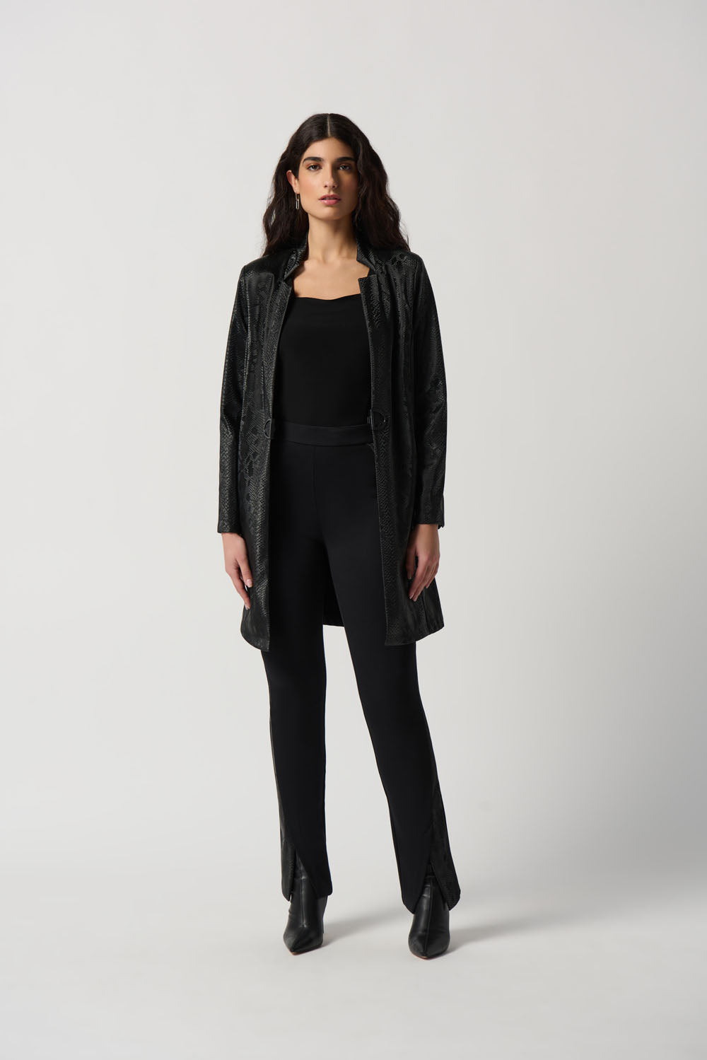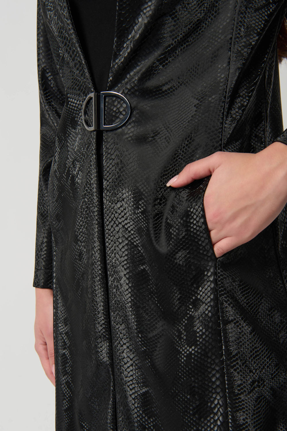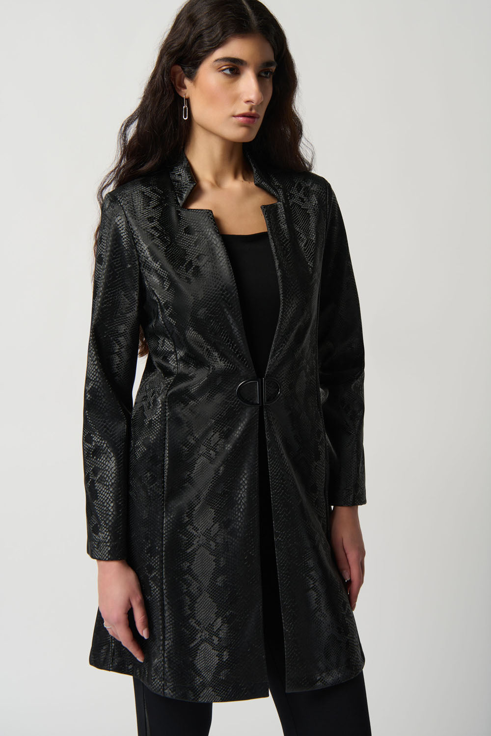 Joseph Ribkoff Black Faux Leather Snake Print A-Line Coat Style 234111