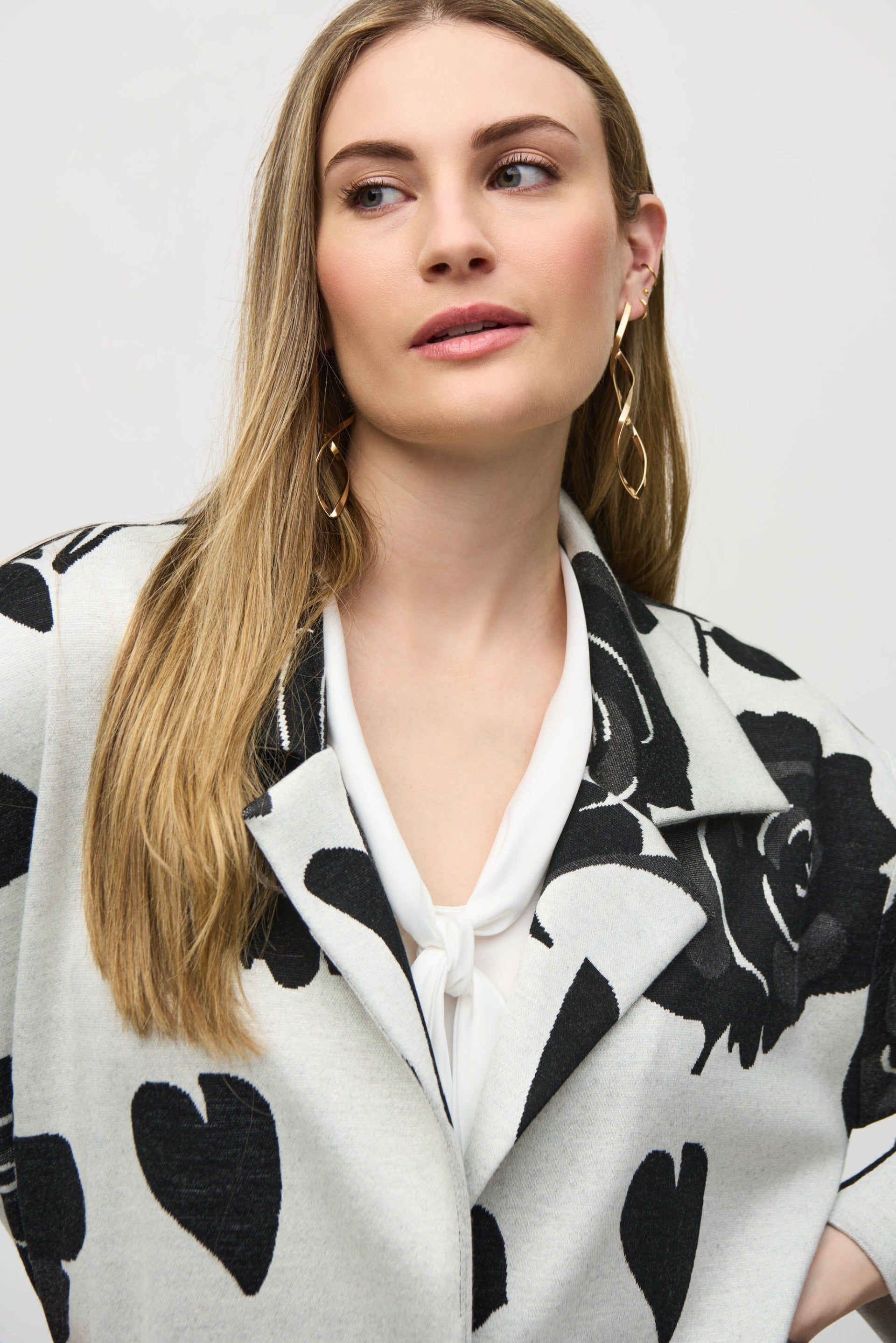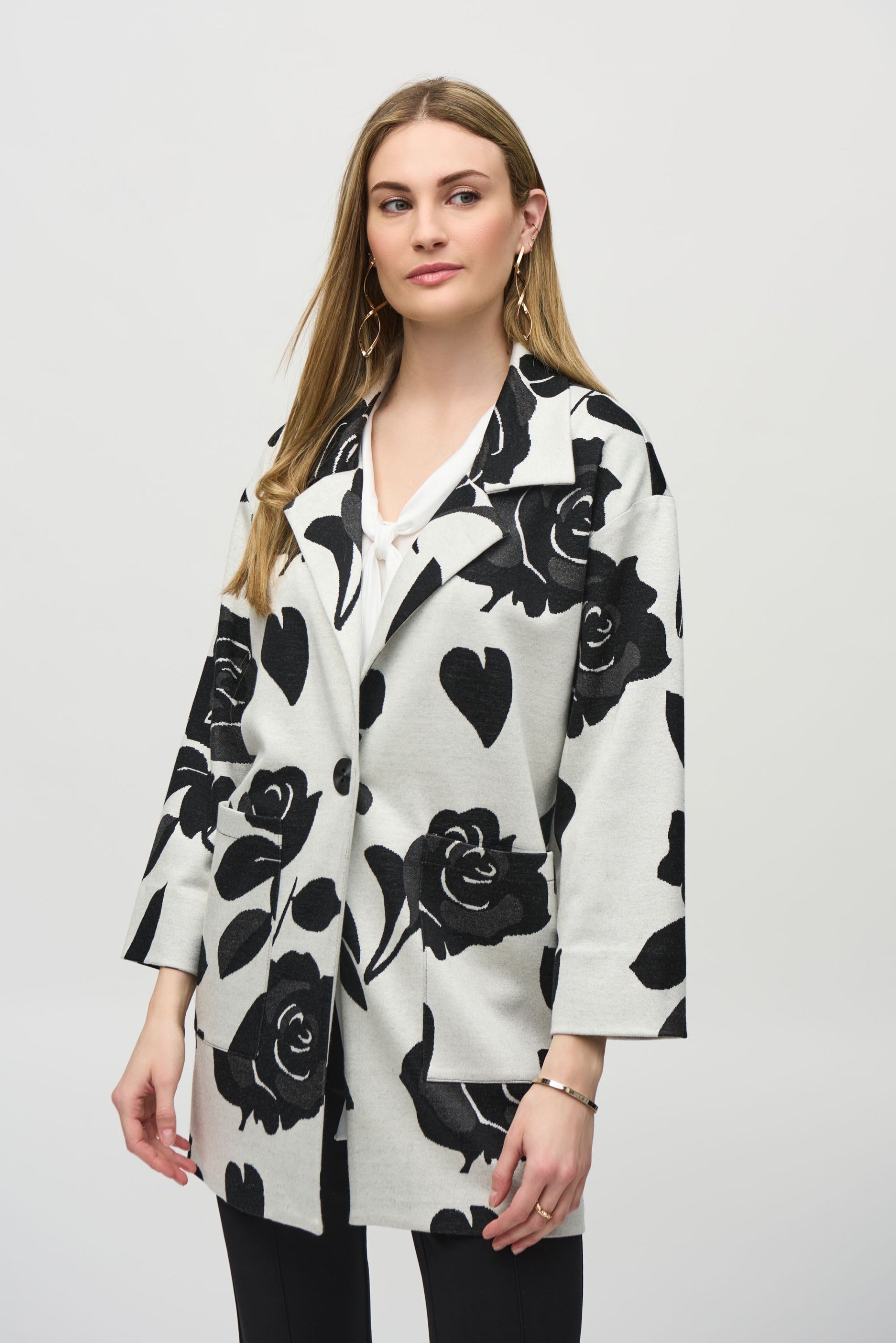 Command attention in every room in this striking jacquard sweater knit coat. The piece boasts an alluring floral print and a sleek notched collar that confer the garment its undeniable appeal. The chic applied pockets and single-button closure complete the coat’s polished look.