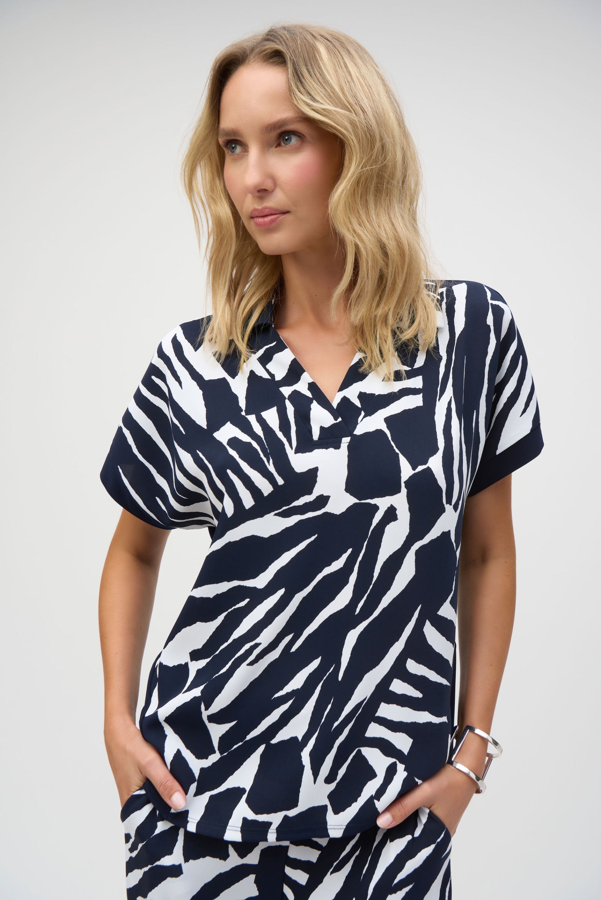 Joseph Ribkoff Vanilla/Midnight Blue Silky Knit Abstact Print Boxy Top Style 252146