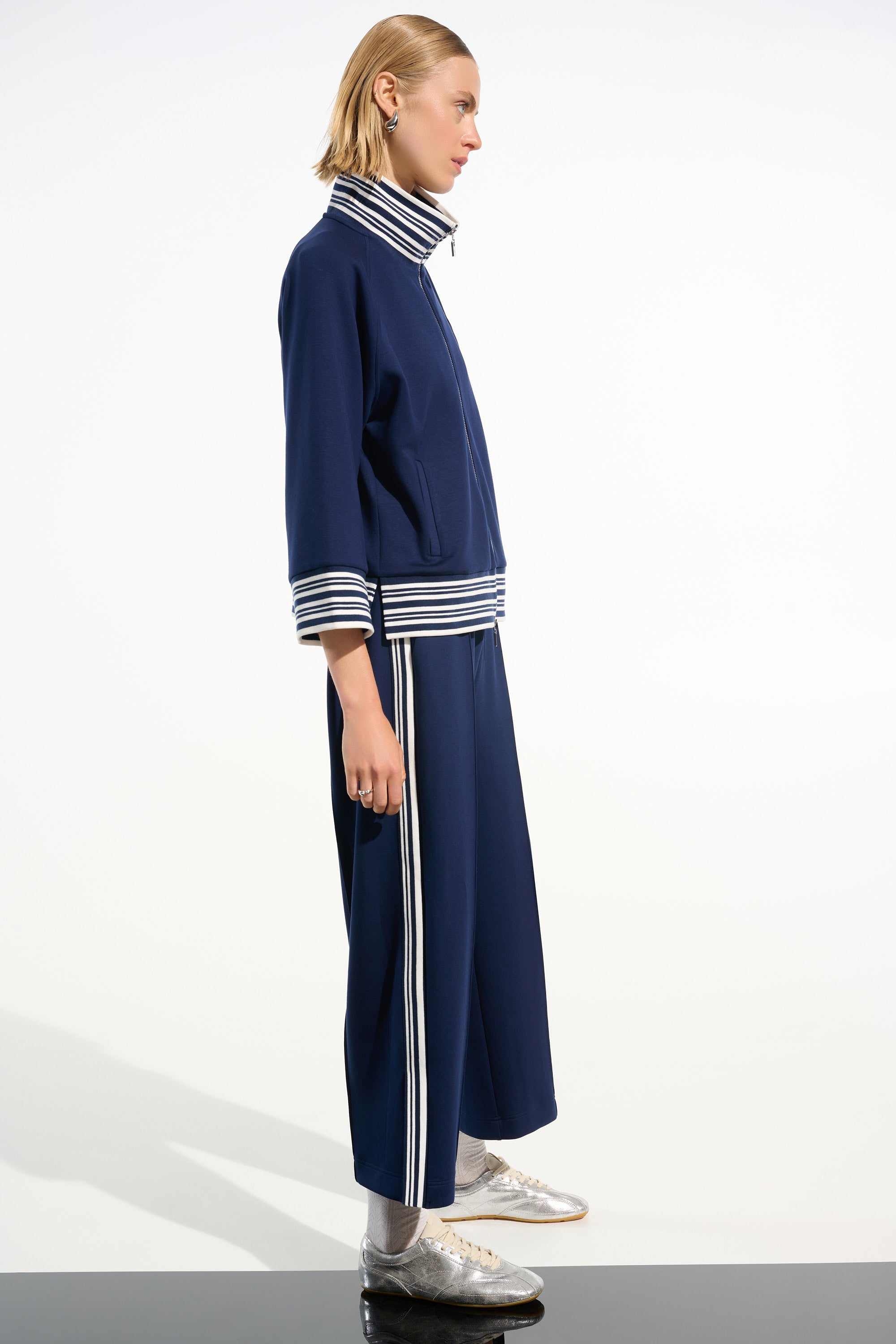 This Joseph Ribkoff jacket combines sporty sophistication with refined details. Designed with a metallic front zipper, striped rib trim, and three-quarter raglan sleeves, it offers a sleek silhouette perfect for layering. The funnel collar adds a modern touch, ensuring comfort and style throughout your day-to-evening looks.