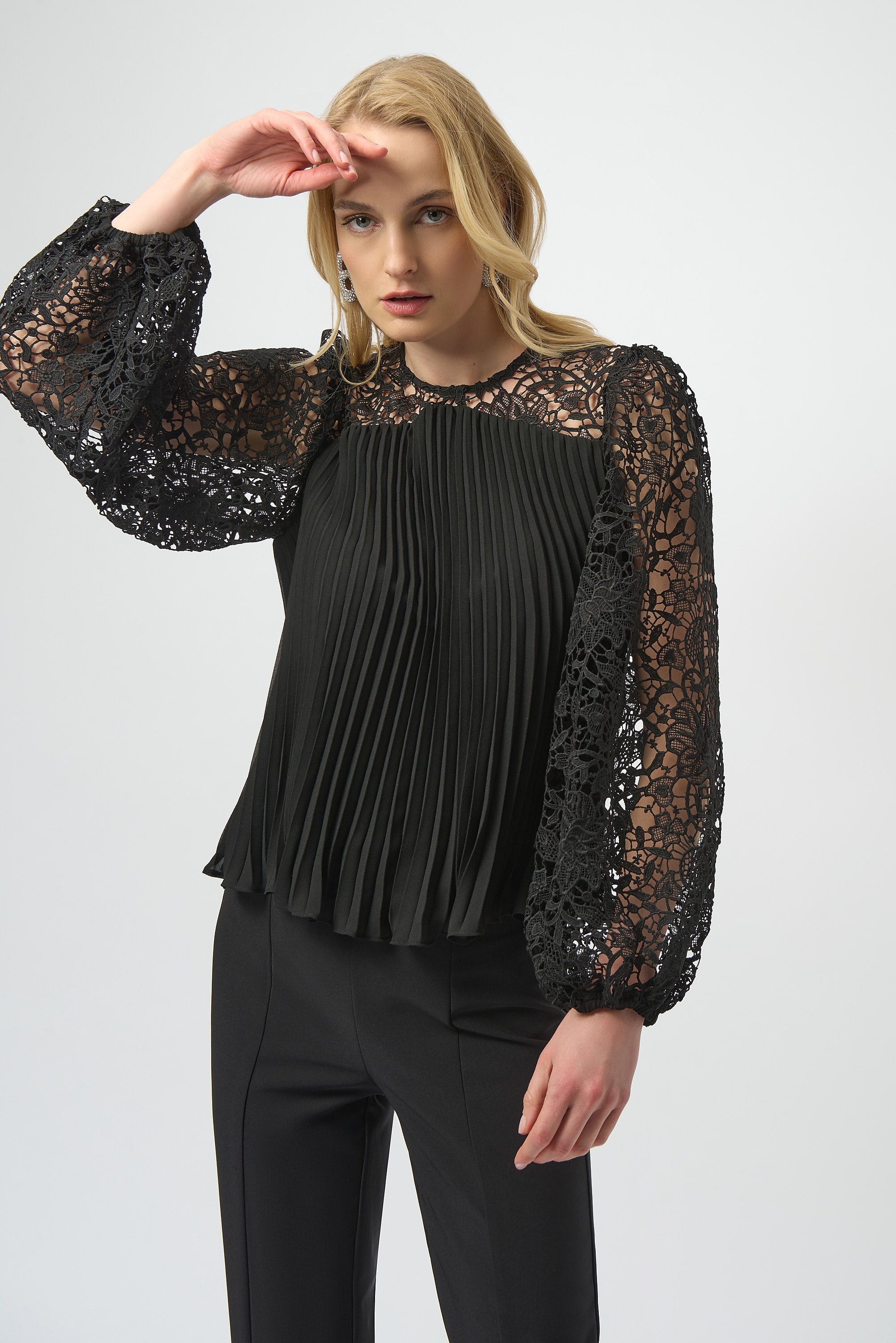 Joseph Ribkoff Black Pleated Chiffon Top With Floral Lace Sleeves Style 254900