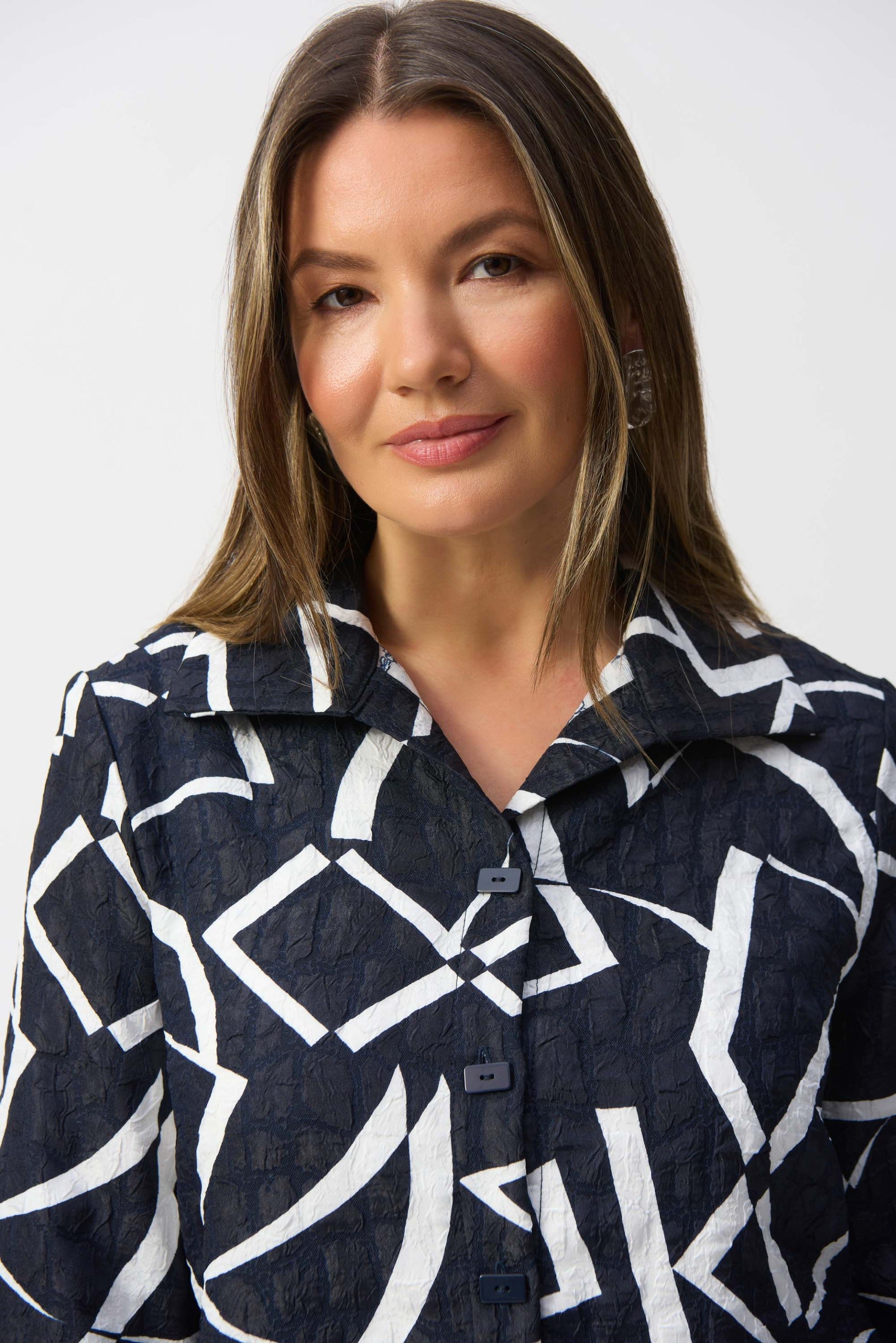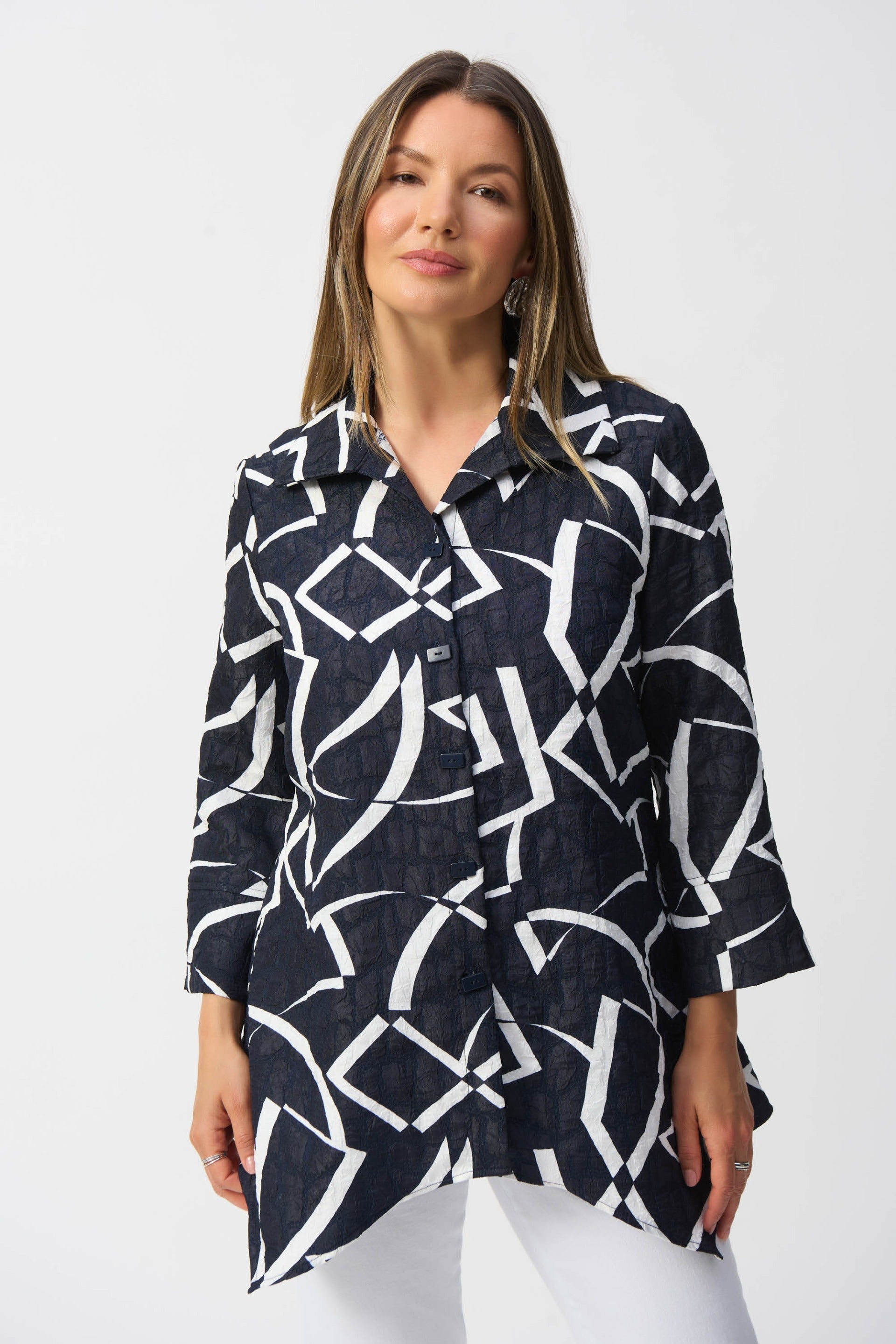 Joseph Ribkoff Midnight Blue/Vanilla Jacquard Abstract Print Handkerchief Jacket Style 251021.