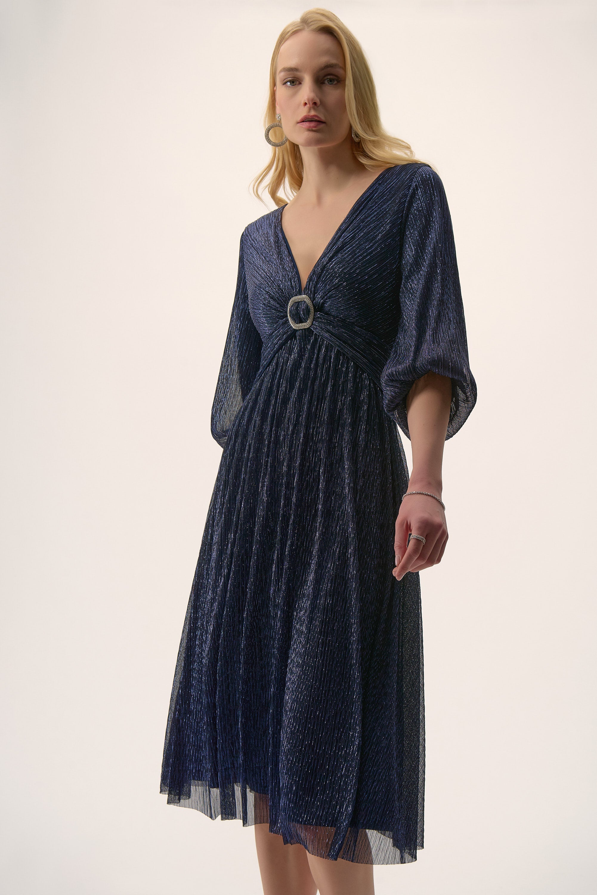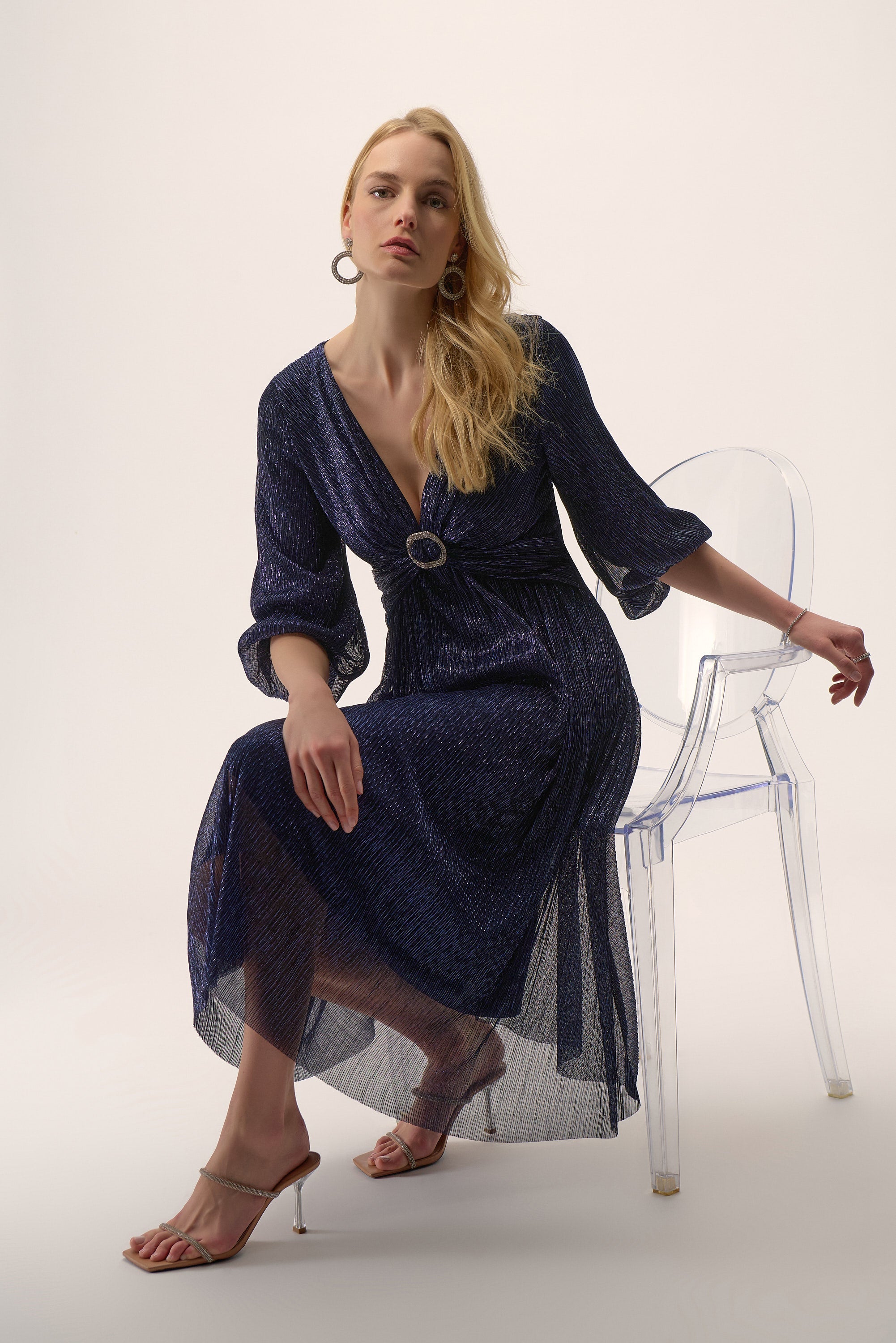 This Joseph Ribkoff dress features a sparkle mesh plissé fabric that catches the light beautifully. Its wrap neckline with a front twist and rhinestone buckle creates a refined focal point, while the fit-and-flare silhouette enhances your shape. Falling to a stylish mid-calf length, this dress offers an elegant and sophisticated look perfect for special occasions.