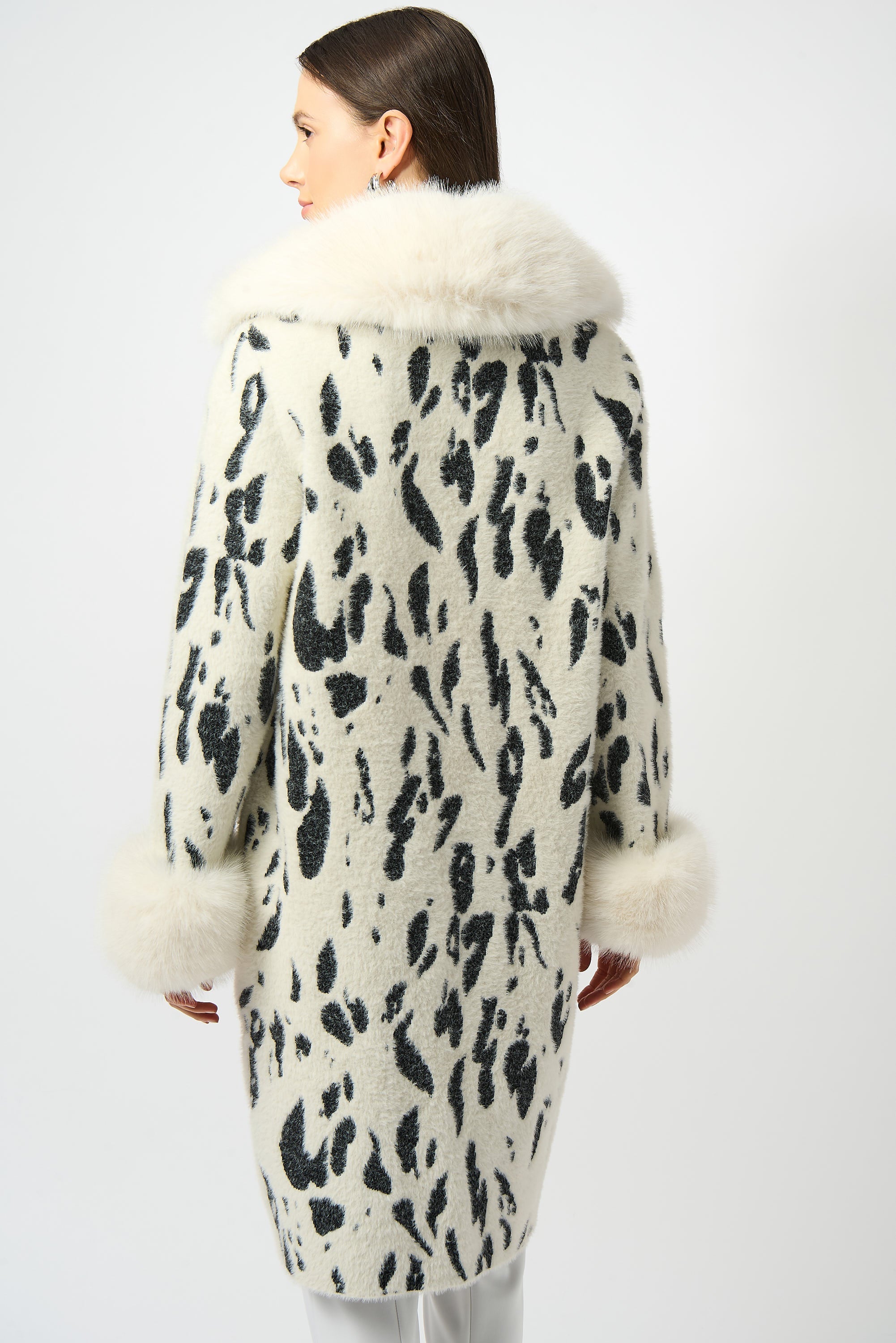 Joseph Ribkoff Winter White/Black Feather Yarn Animal Jacquard Coat with Faux Fur Trim Style 253904.