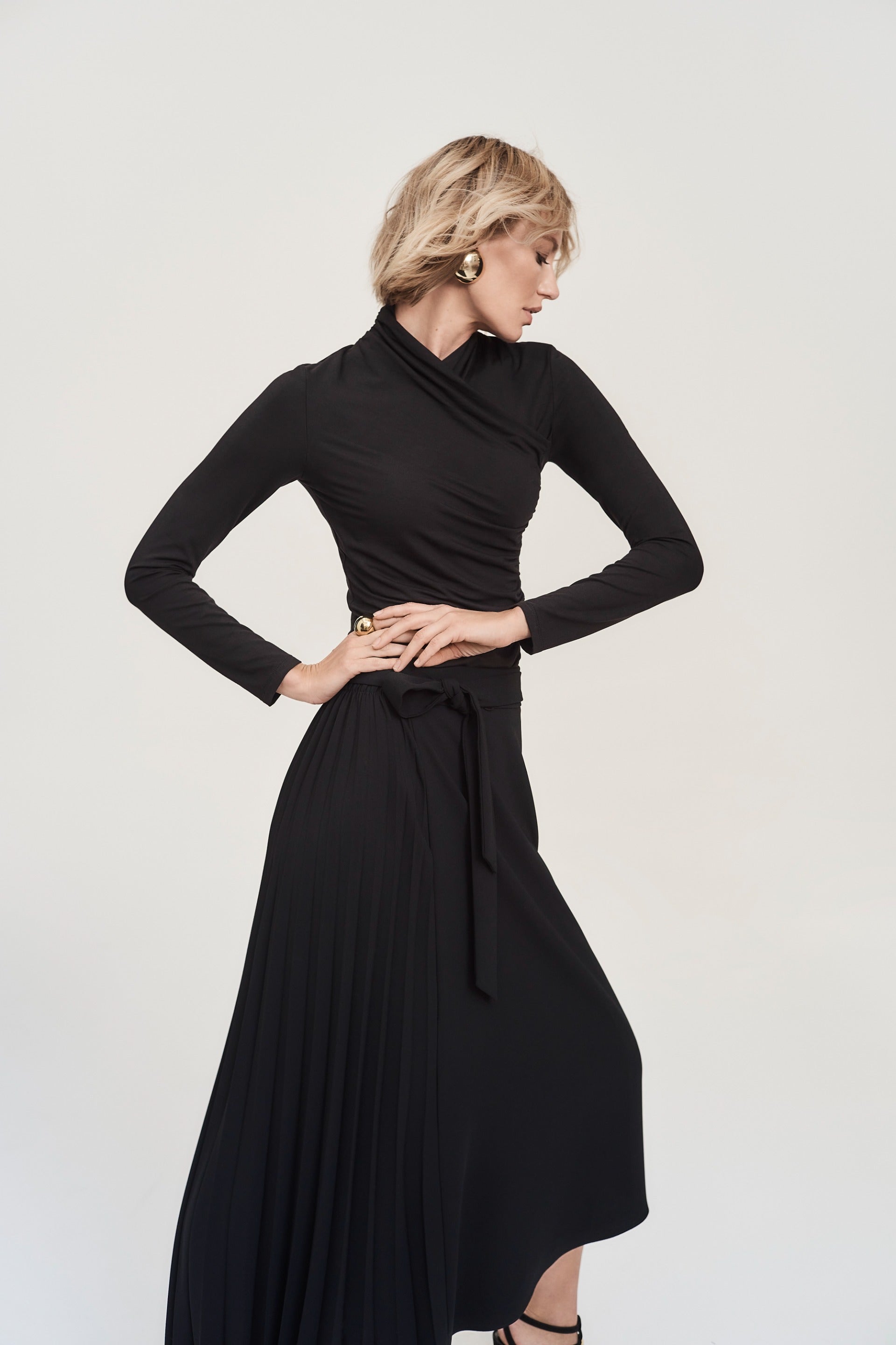 Indulge in understated glamour with this beautiful black jersey knit top. The wrap neckline and long sleeves pair to perfection to add poise and a timeless elegance to this design. Delicate side shirring compliments the garment’s alluring fitted silhouette and creates a look that can seamlessly transition from day to night.