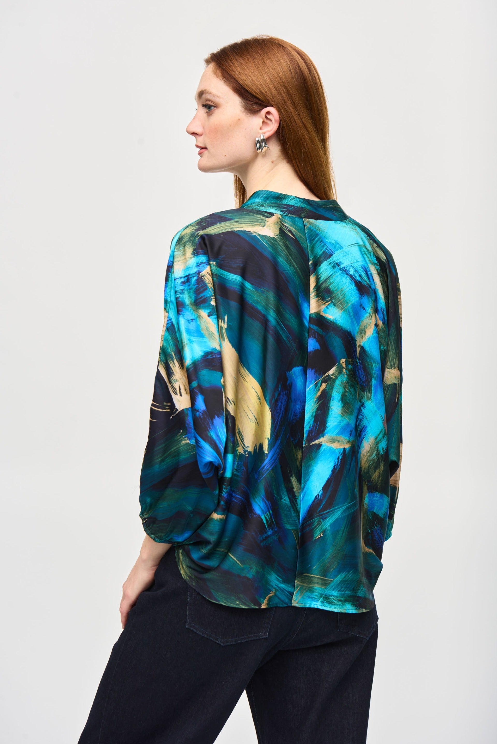 A beautiful fusion of artistic expression and refined style, this satin abstract print top instantly elevates any ensemble. The sleek V-shaped neckline paired with the three-quarter dolman sleeves with elastic shirring at the hem complement the exquisite cocoon silhouette to perfection. An alluring knot at the hem adds a hint more of charm to this modern design.