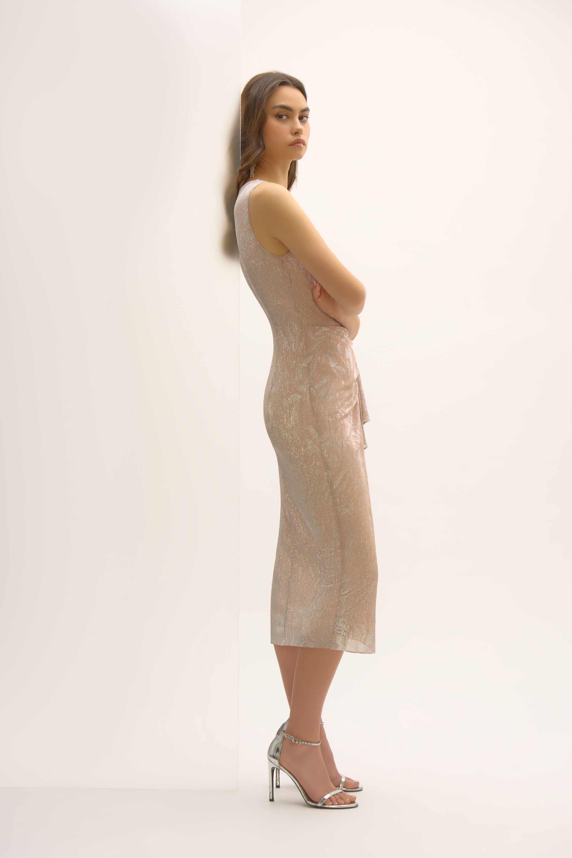 Joseph Ribkoff Quartz/Silver Foiled Plissé Novelty Knit Sheath Dress Style 252706