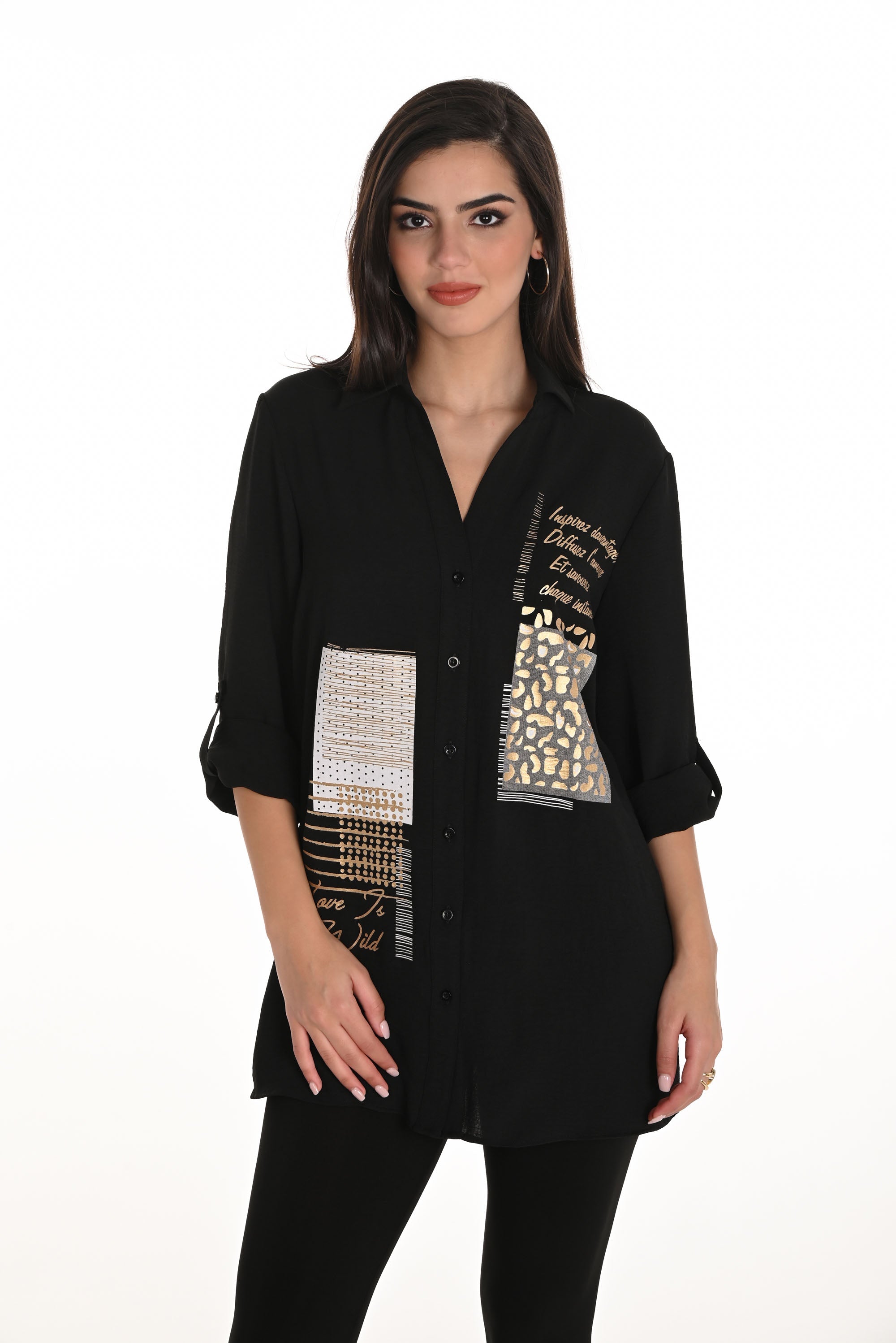Frank Lyman Black/Gold Geometric & Text Print Top Style 253750