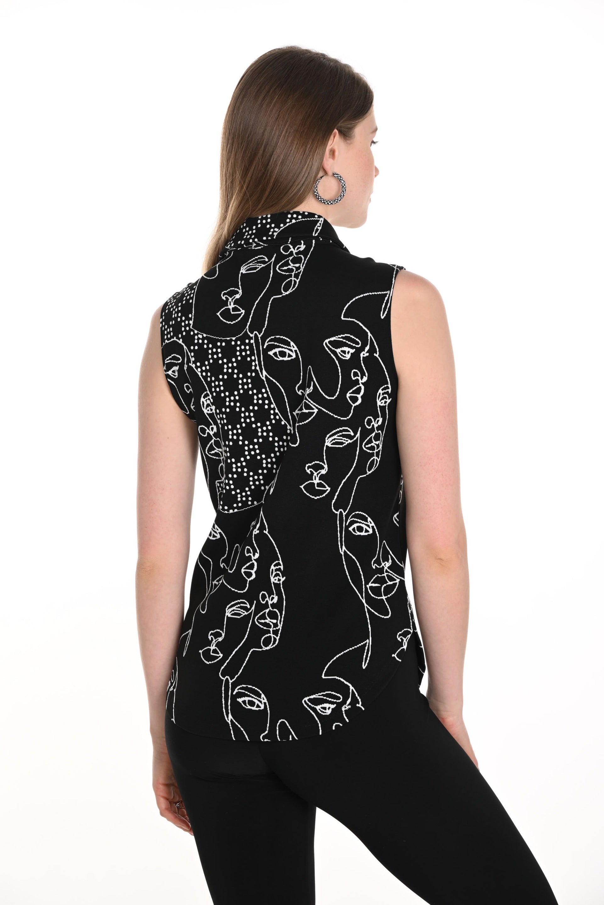 Frank Lyman Black/Off-White Face Print Sleeveless Top Style 256163