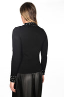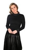 This black sweater knit top exudes timeless elegance with its understated design, elevated by delicate rhinestone accents gracefully adorning the neckline and sleeve trims. Its subtle sparkle adds a touch of sophistication to any ensemble, making it a versatile wardrobe essential for both casual and formal occasions.