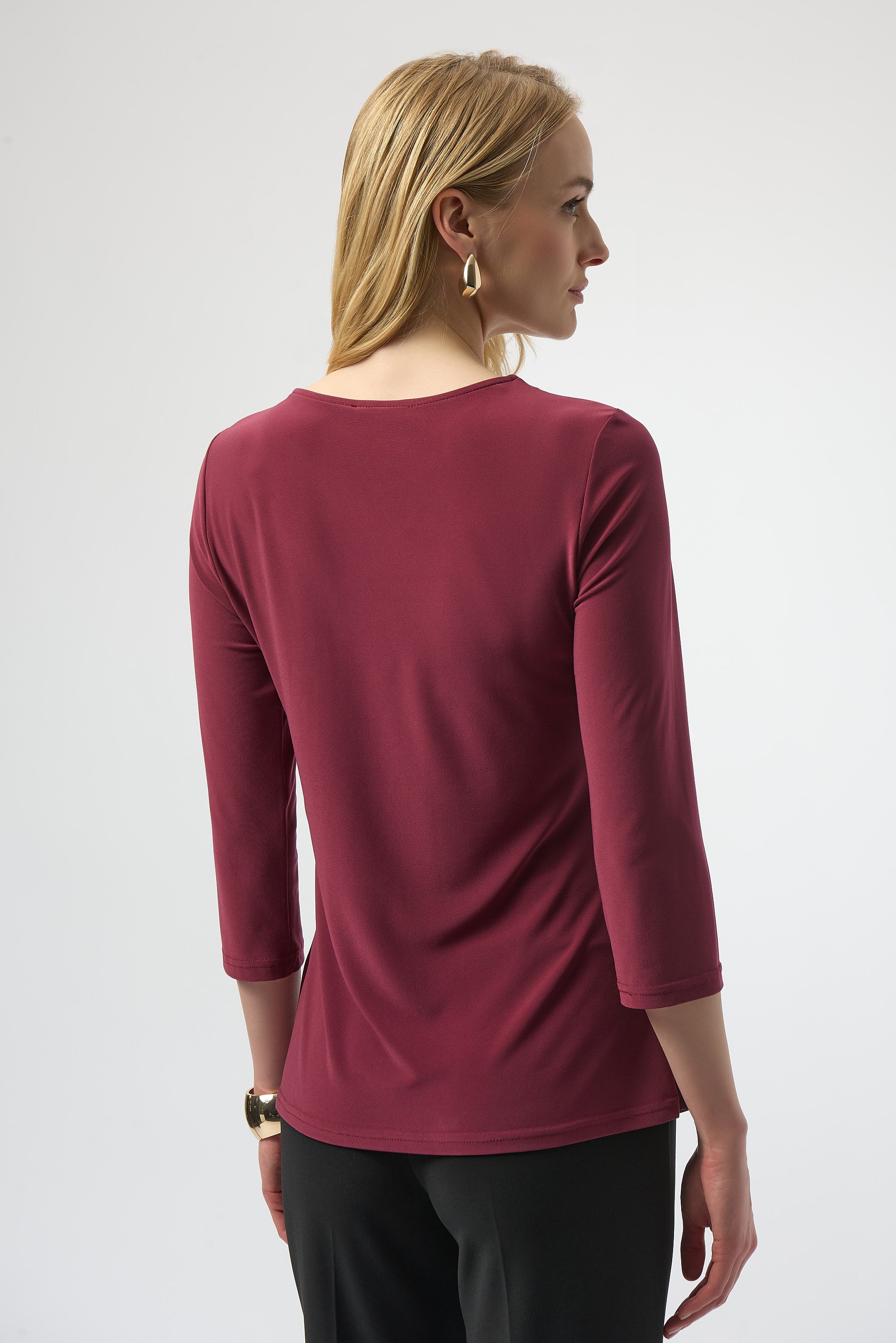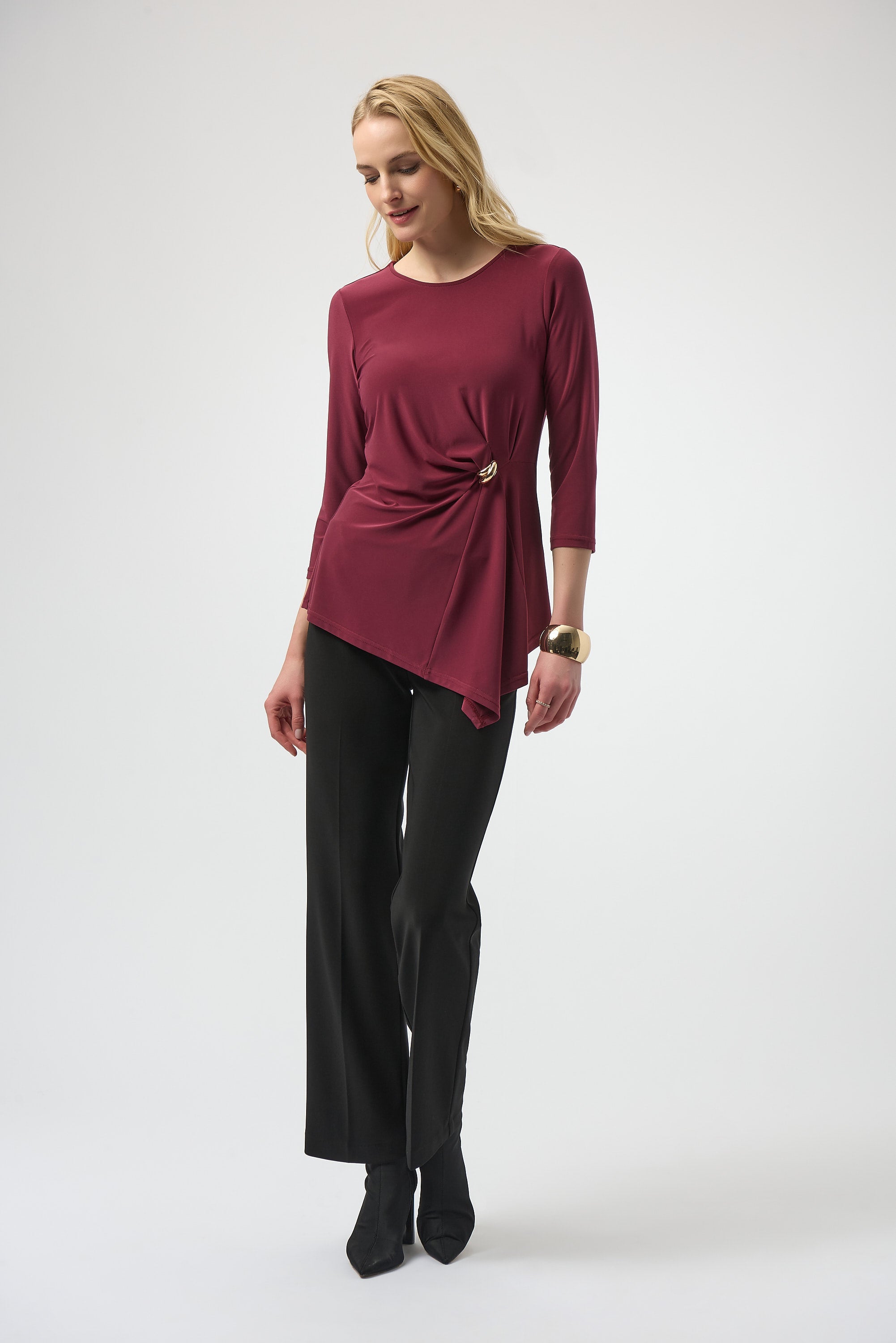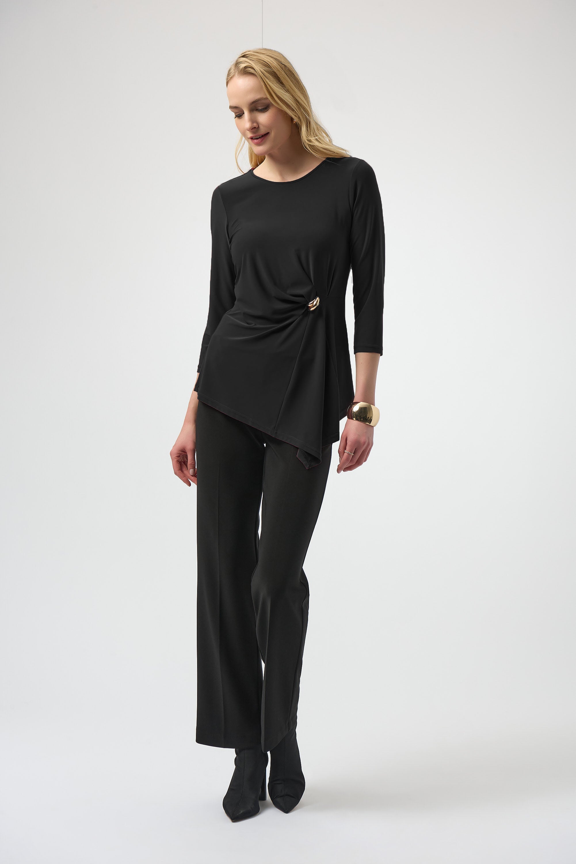 This Joseph Ribkoff asymmetrical top blends sophisticated design with expert craftsmanship. Its silky knit fabric drapes elegantly, enhanced by a unique asymmetrical silhouette and refined three-quarter sleeves. Impeccable front pleats add depth, while a delicate ornament detail elevates the piece's timeless appeal, making it a versatile choice for the modern wardrobe.