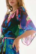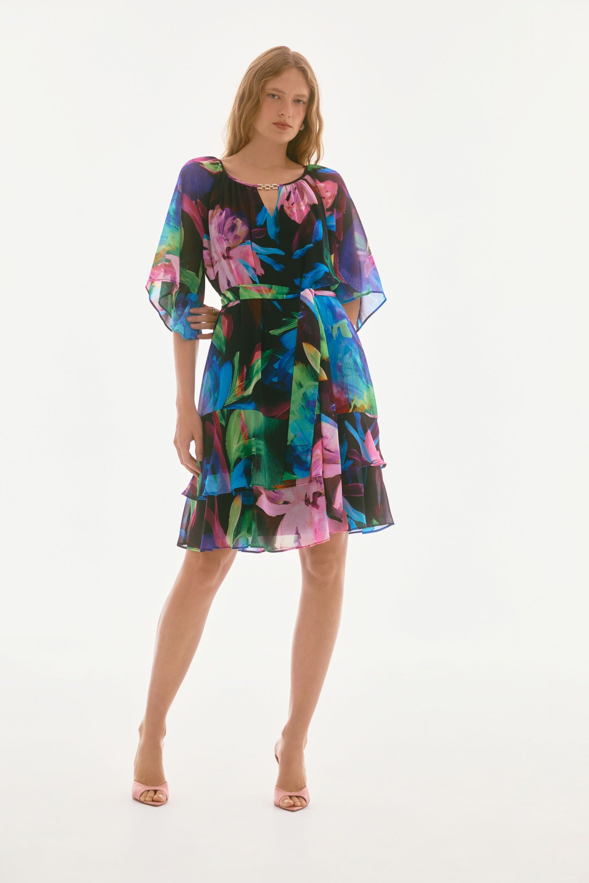 Details: Floral print. Slit neckline with keyhole and ornament. Raglan flutter sleeves. Tiered flounce skirt. Sash belt. Lined.