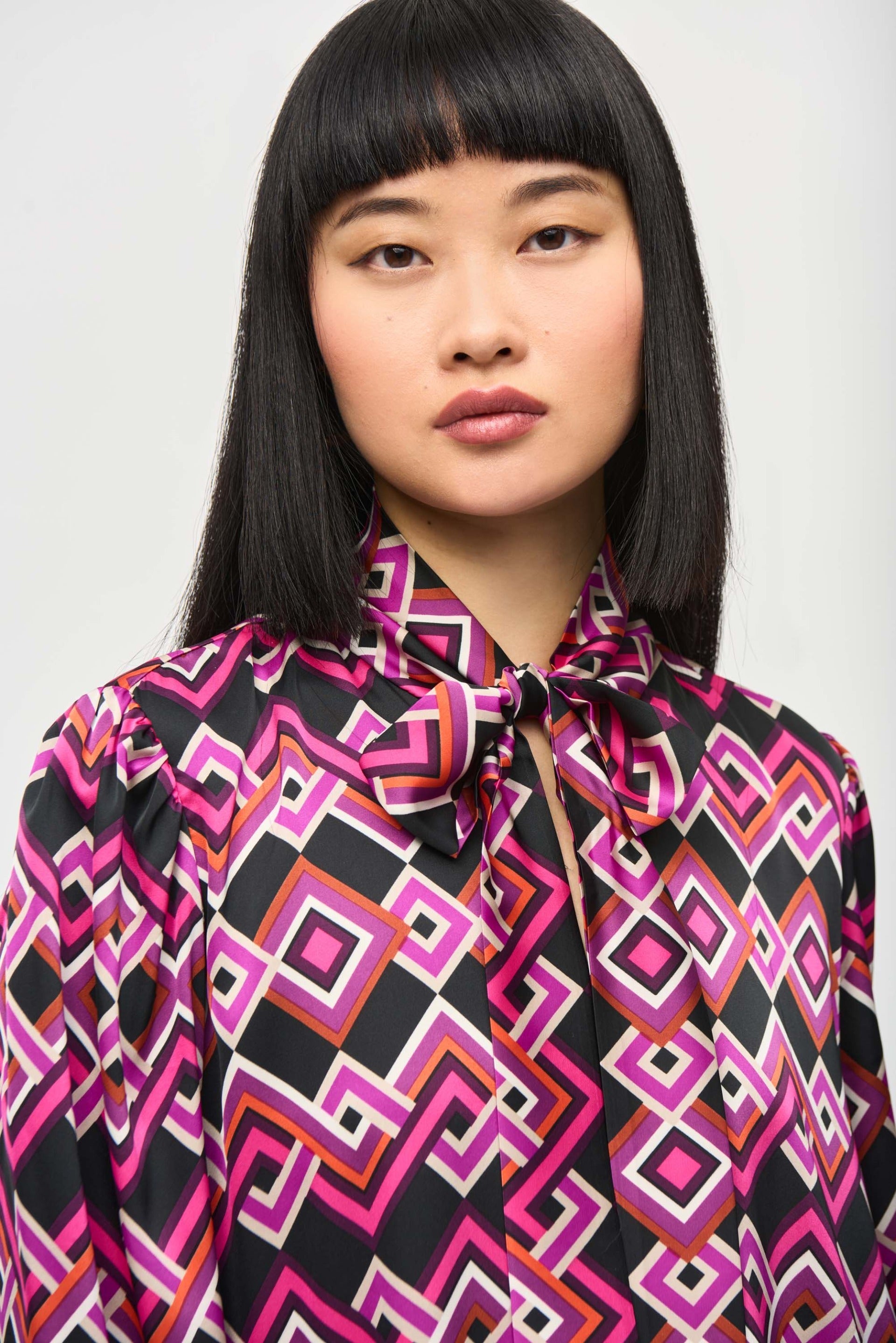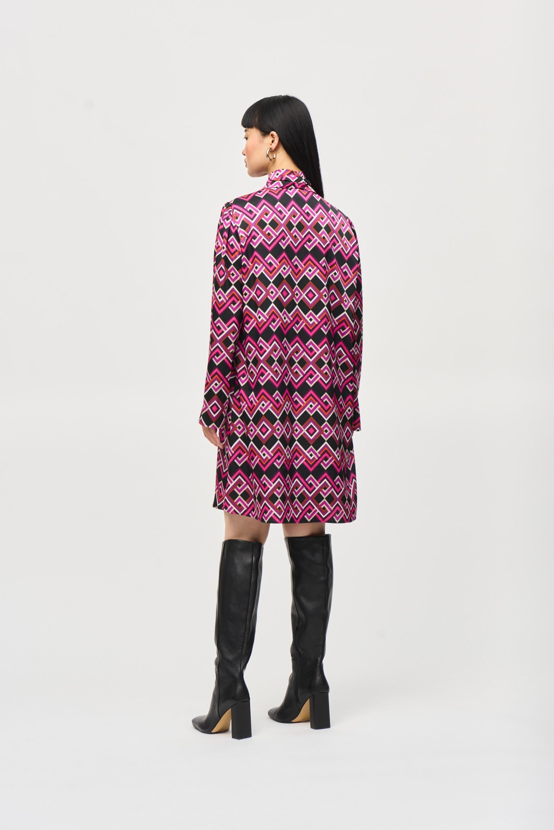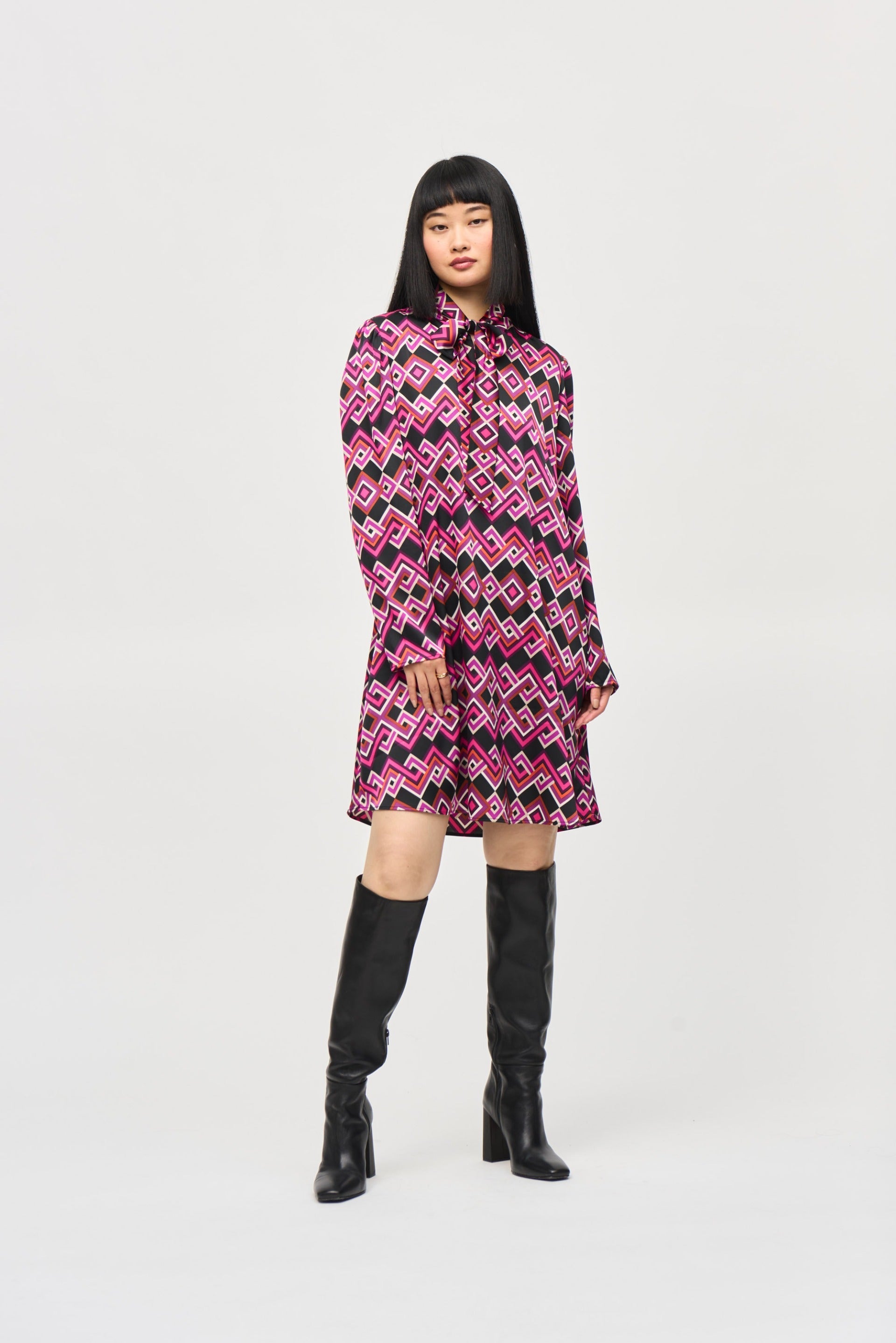 Indulge in the glamour of this stunning A-line dress. Adorned with an enchanting geometric print, the smooth silky knit design envelops the figure with irresistible charm. The garment also presents a chic V-shaped neckline with a lovely scarf tie that adds a hint more of poise to this contemporary look.