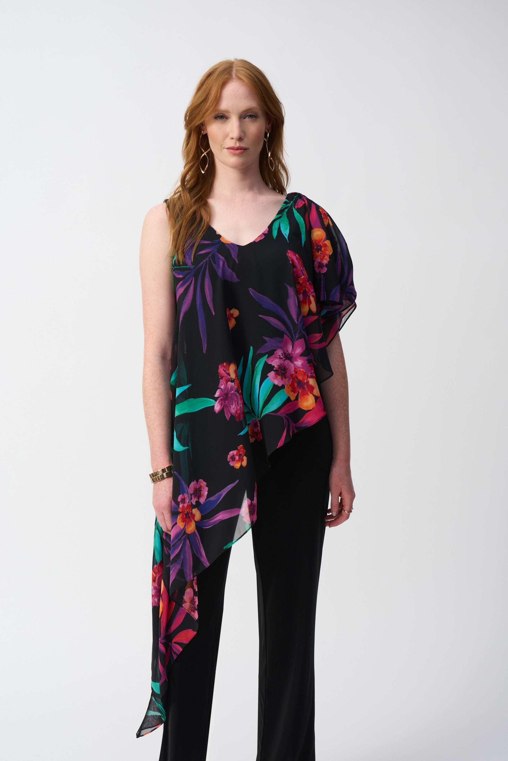 Joseph Ribkoff Black/Multi Silky Knit Jumpsuit With Tropical Chiffon Overlay Style 251152