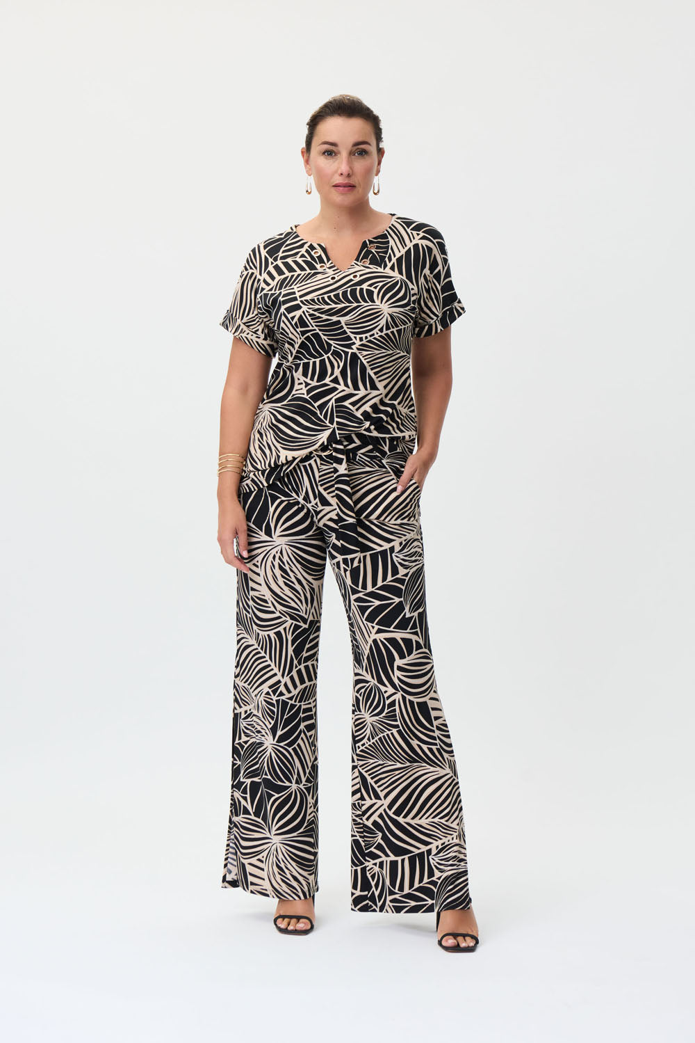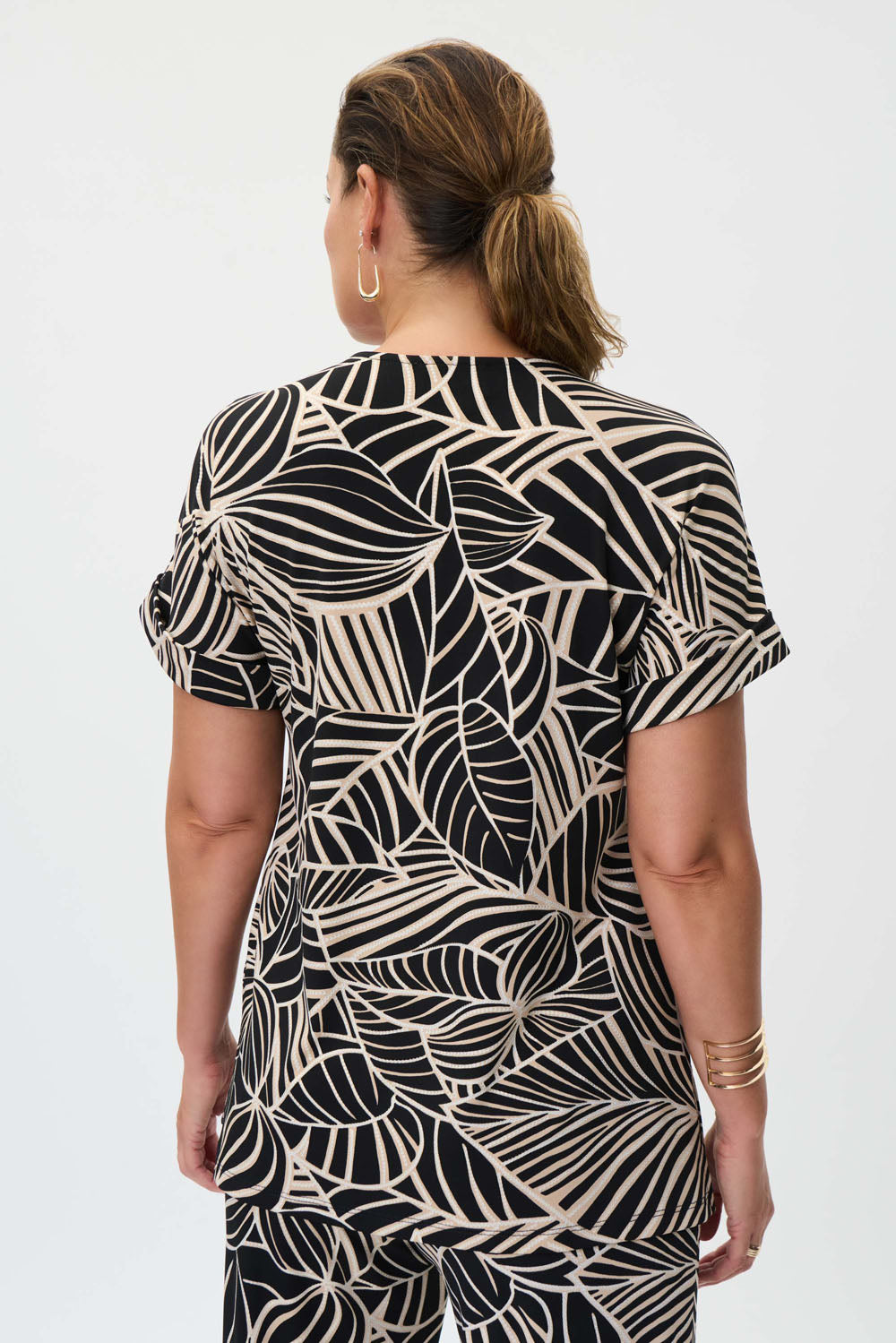 Reminiscent of the dinner parties and soirées of the 1920s, this gleaming top is a gorgeous addition to any wardrobe. Crafted from a silky-smooth collection of interlock twist yarn fabrics, this piece features a unique tropical print and short dolman sleeves. A slit neckline comes with eyelet detailing to pull the piece together.
