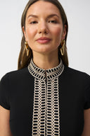 This silky knit dress exudes impeccable style. The piece presents a mandarin collar and a zipped neckline, adding sophistication to the classic shift silhouette. A delicate gold Lurex trim detail adorns the collar and front of the garment, injecting a hint of glamour to this stunning design.
