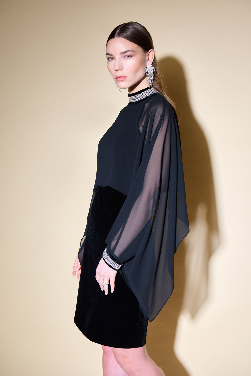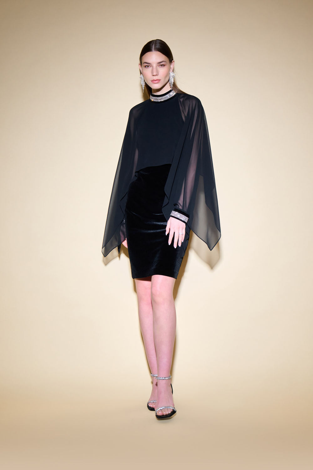 Joseph Ribkoff Black Velvet And Chiffon Dress With Cape And Rhinestone Collar Style 234706