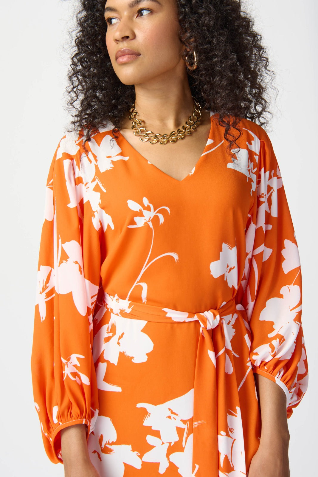 Joseph Ribkoff Mandarin/Vanilla Floral Print Puff Sleeve Belted Dress Style 241207