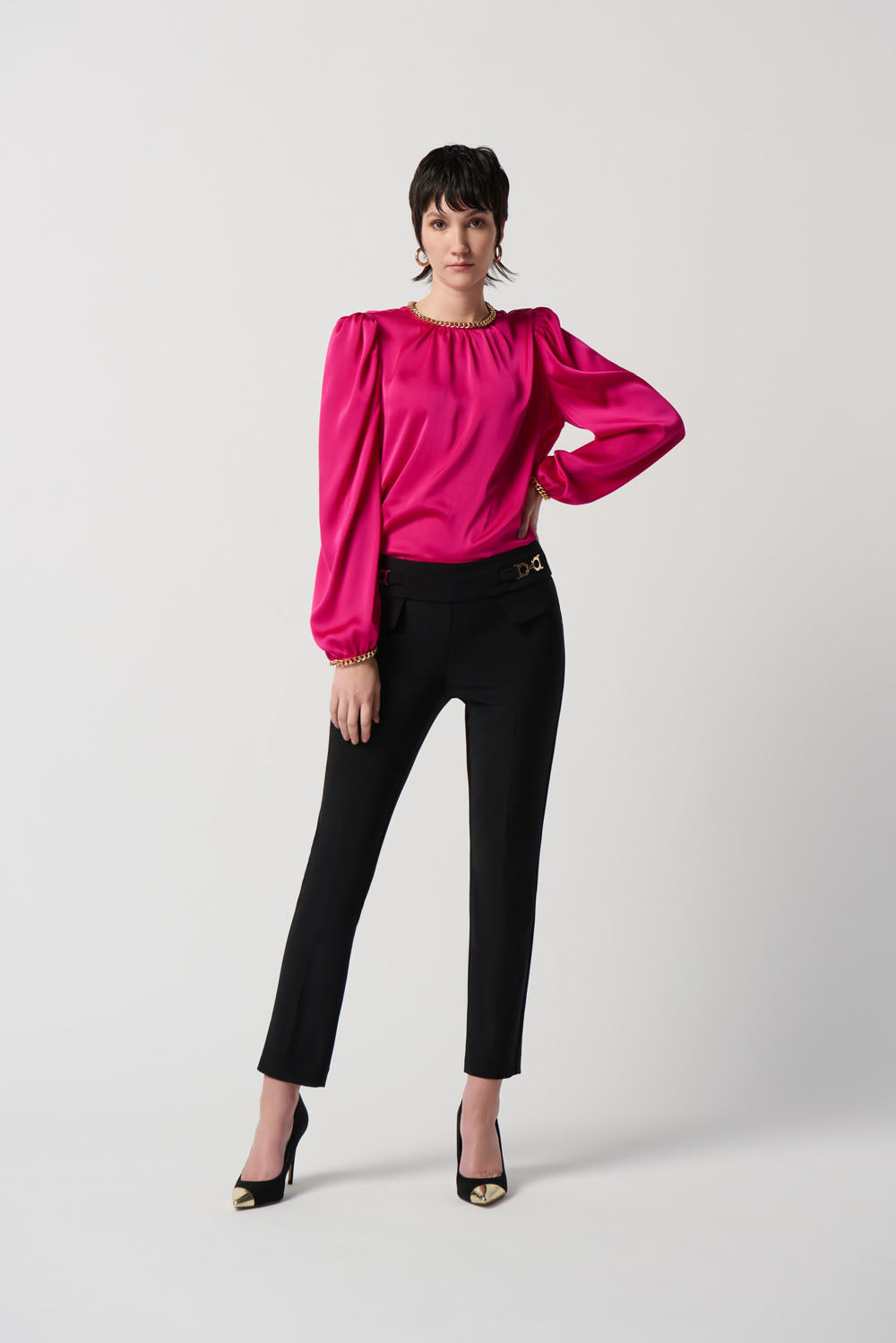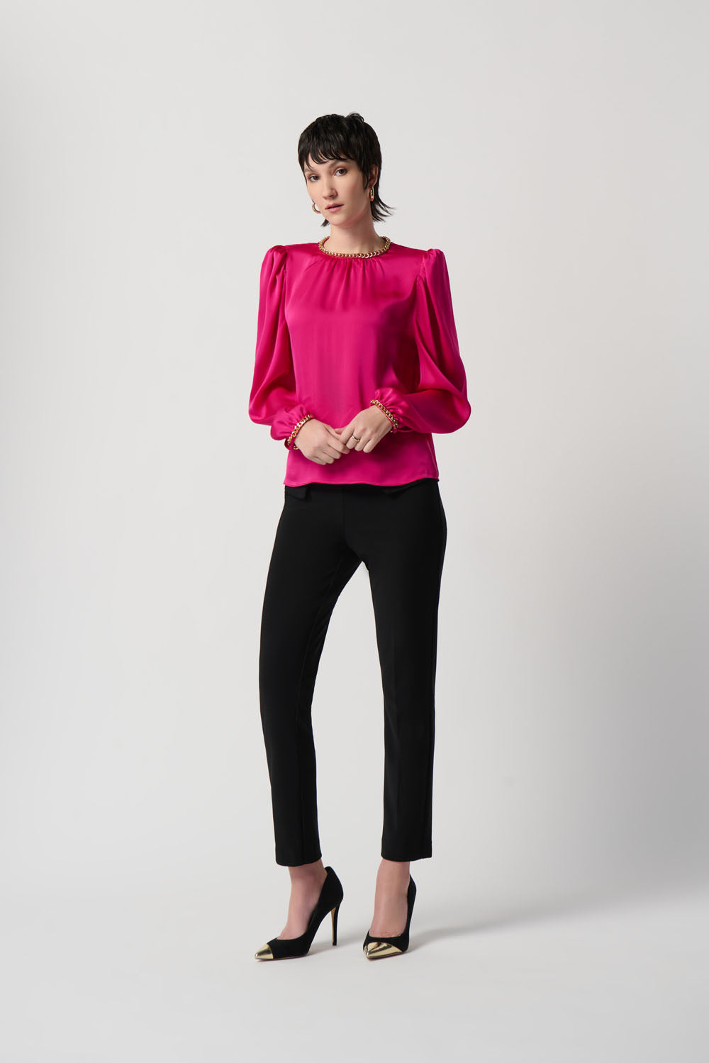 Joseph Ribkoff Shocking Pink Satin Puff Sleeve Top With Gold Chain Style 234934