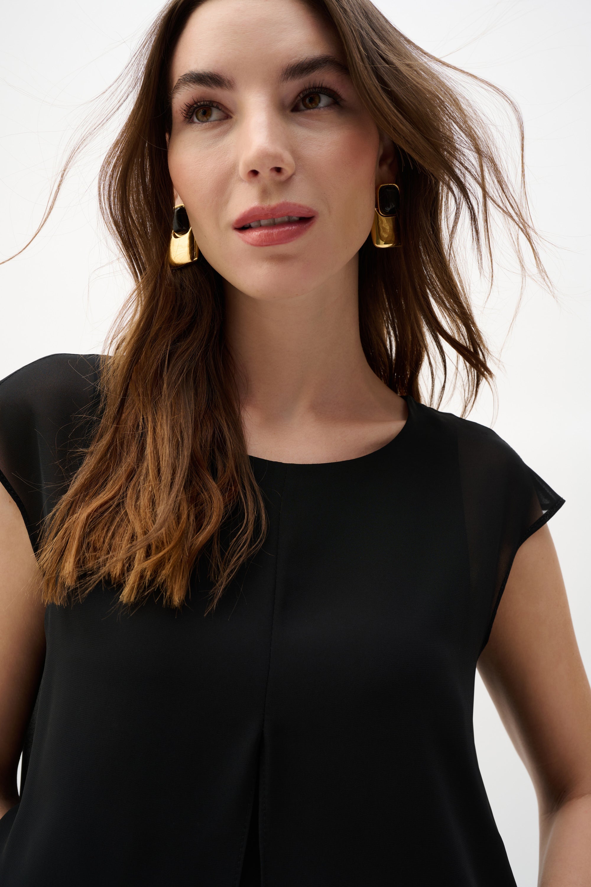 • Weekend Refinement: Contrast the delicate chiffon with Joseph Ribkoff’s Featherweave denim or slim-fit white trousers. Finish the look with gold statement earrings and a leather tote for a sophisticated brunch outfit.