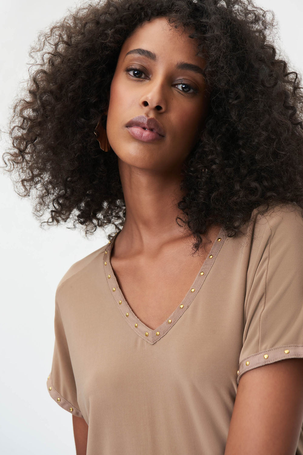 Joseph Ribkoff Tiger's Eye V-Neck Short Sleeve Top With Studs Style 232024